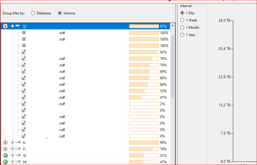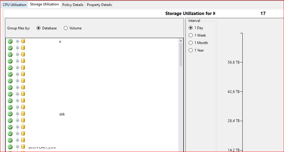 Storage Utilization kısmından Database’i seçersek hem veritabanının büyüme geçmişine bakabiliriz hemde veritabanı isminin yanındaki boş kutucuğa tıklayarak file doluluk oranını görebiliriz. Volume kısmında ise sunucu üzerinde bulunan disklerin doluluk oranını görebiliriz.