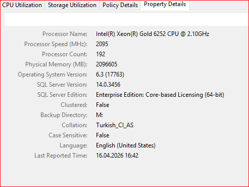 Property details kısmında ise sunucu ve sql server’la ilgili bilgiler görülmektedir.
