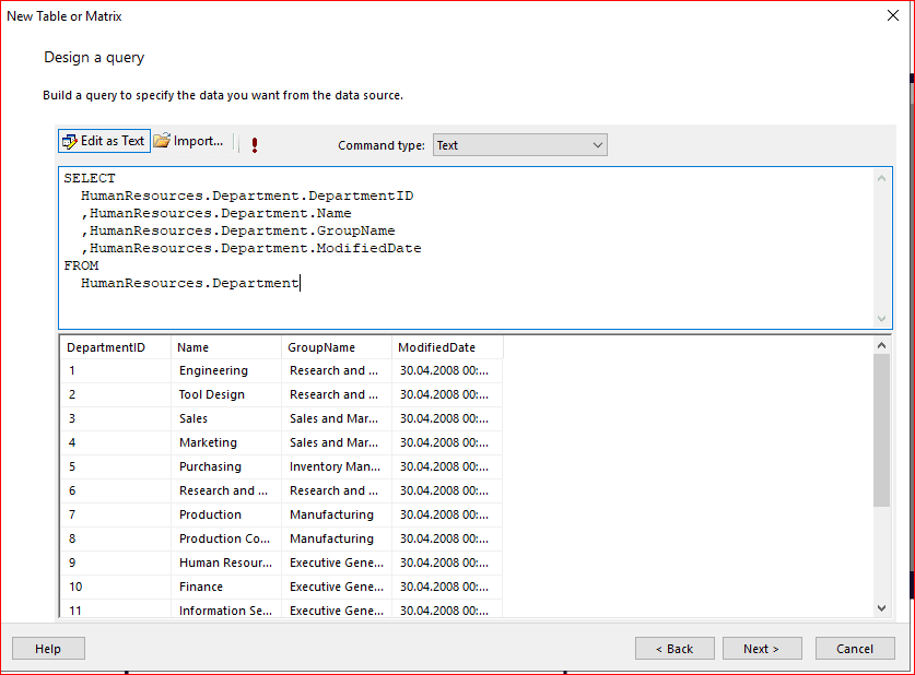 İlk kısım olan Table or Matrix Wizard bölümünden yeni bir rapor oluşturalım.