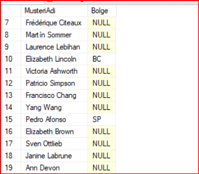 select MusteriAdi, isnull(Bolge,'BilinmiyorX') from Musteriler