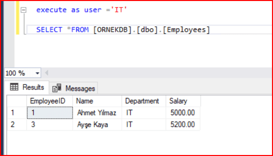Bir çalışan tablosunda, her çalışanın yalnızca kendi departmanındaki kayıtları görebilmesini sağlayalım.