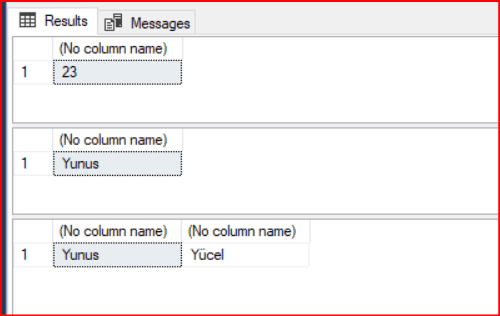Select 'Yunus' +'Yücel' IsımSoyısım,30 as Yas