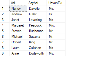 Aşağıdaki sorgumuzda kullanıcıların Ünvan ekinin yanında Ms. veya Mrs. ise Kadın, Mr. ise Erkek yazmasını sağlayacağız. İlk olarak aşağıdaki sorguda tablomuza select çekip genel durumu görelim.