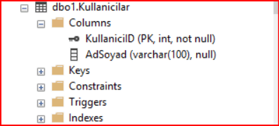 Aşağıdaki komutla belirtilen kolon üzerinde bir isim değişliği yapmış oluruz. Değişiklik yapmadan tablodaki kolon ismi aşağıdaki resimde görülmektedir.
