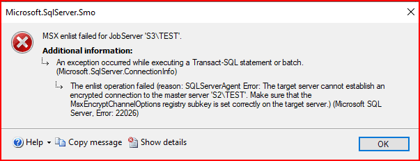 The enlist operation failed (reason: SQLServerAgent Error: The target server cannot establish an encrypted connection to the master server ‘S2\TEST’. Make sure that the MsxEncryptChannelOptions registry subkey is set correctly on the target server.) (Framework Microsoft SqlClient Data Provider)