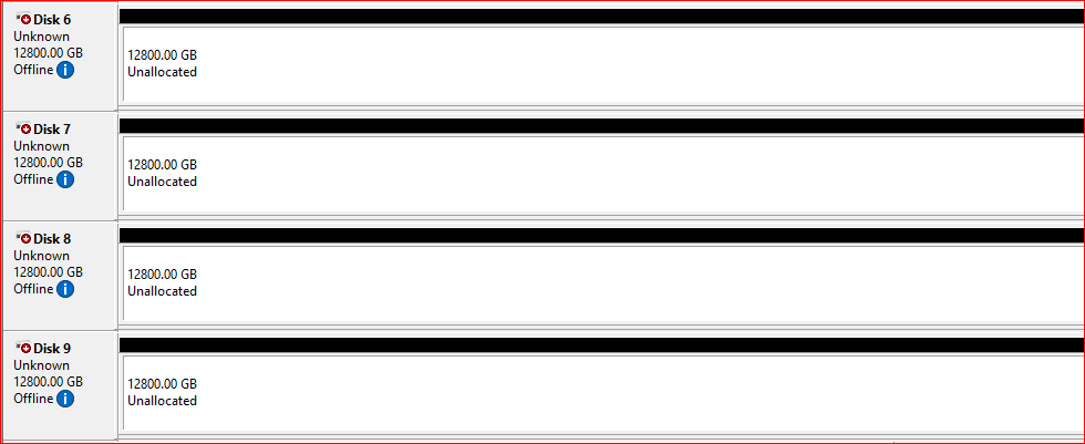 Storage kısmından 12 TB’lık bir alan tanımlanmıştır. Oluşturulmuş diskin üzerinde 4 tane FC port yapısı bulunduğundan dolayı Disk Management ekranında aşağıdaki resimde 4 farklı disk olarak görülmektedir. Bu makalemizde ise bu yapının sunucumuz tarafında düzeltilmesi işlemini ele almış olacağız.