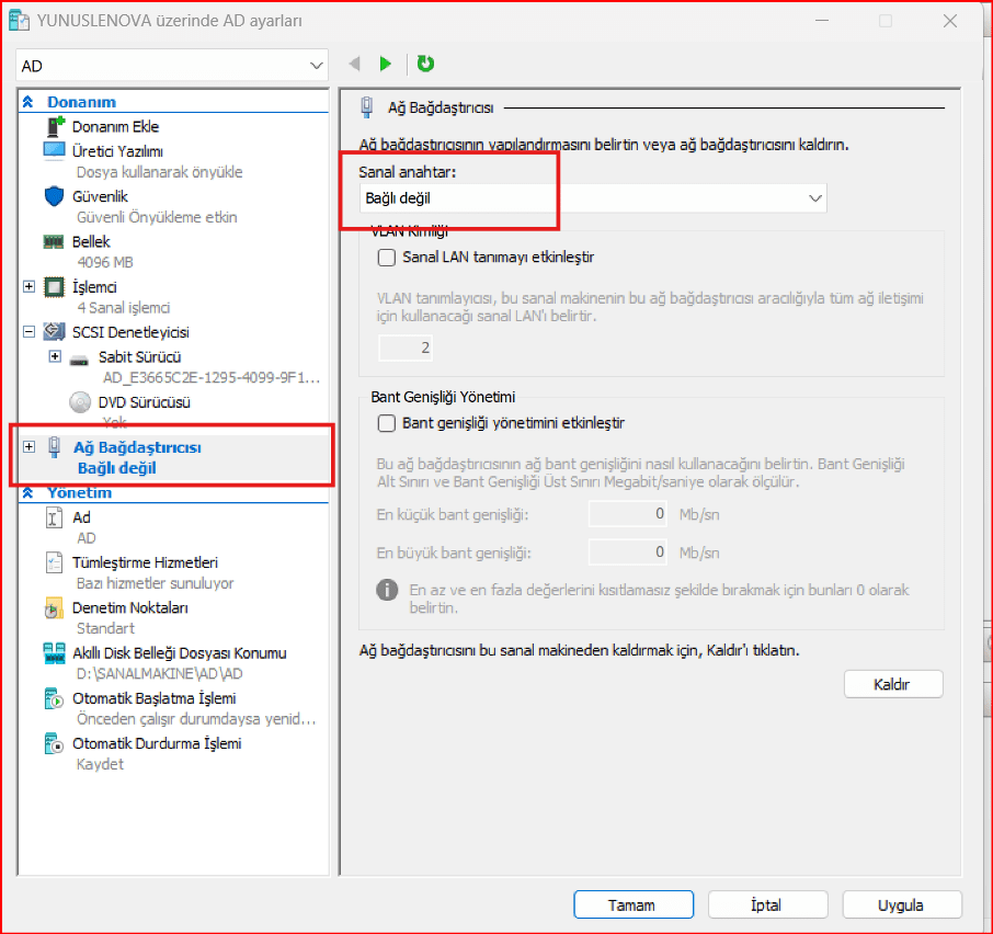 Sanal anahtar bölümünde bulunan Bağlı değil kısmını default yaptıktan sonra sanal makine masaüstünde oluşturduğum default switch’in bağlanmasını sağlamak için bir şeçenek karşıma çıktı.