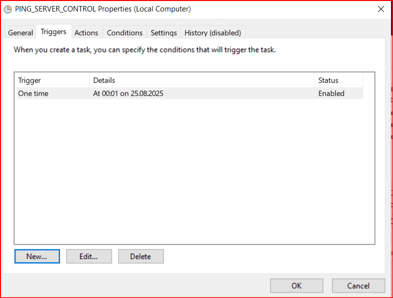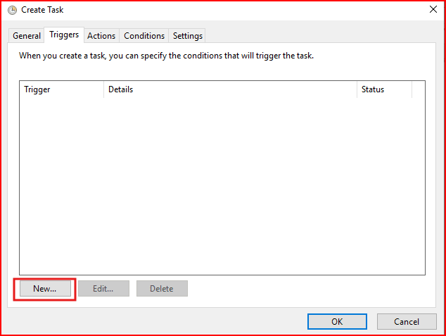 Bu bölümde gerekli ayarlamaları yaptıktan sonra Triggers sekmesine geliyoruz. Gelen ekranda New deyip bir tetikleme zamanı belirtiyoruz. İlgili script kendi içerisinde 1 saniyede bir sürekli tetiklenir ve gün sonunda tekrardan yeni bir gün için txt kaydı oluşturması için yeni günde task tekrardan tetiklenir.