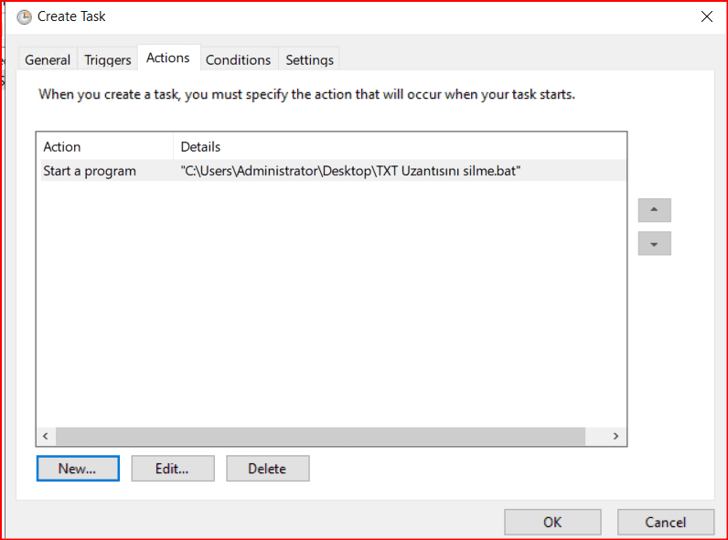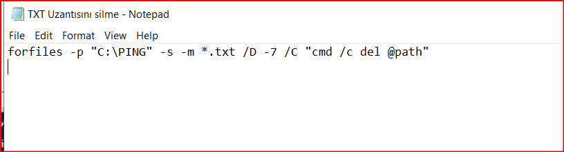 Belirli süreden sonra ping işlemleri hergün bir txt dosyası oluşturduğu için belirli boyutlara ulaşır bunun için Task Scheduler ekranından yukarıdaki belirlediğimiz adımlarda olduğu bir bat uzantılı dosya çalıştırılarak ilgili uzantıda dosyalar belirli gün şartı belirlenerek silinebilir.