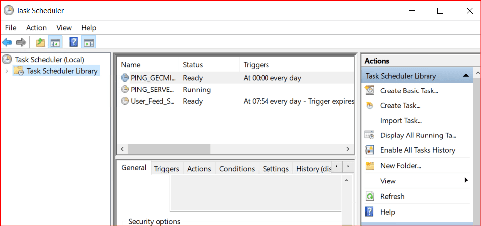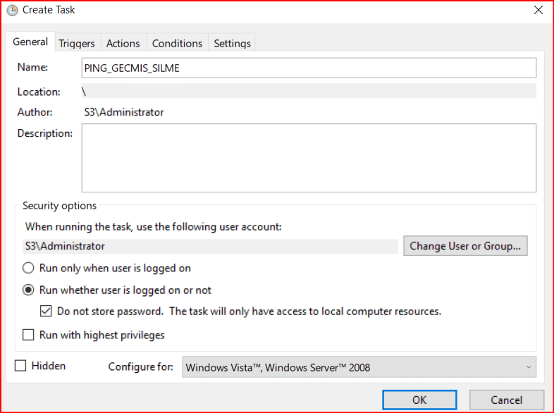 Gelen ekranda General sekmesinde Name kısmında Scheduler’a bir isim veriyoruz. Alt kısımda bulunan security options kısmında Kullanıcı oturum açmışsa da açmamışsa da çalıştır seçeneğini işaretliyoruz.