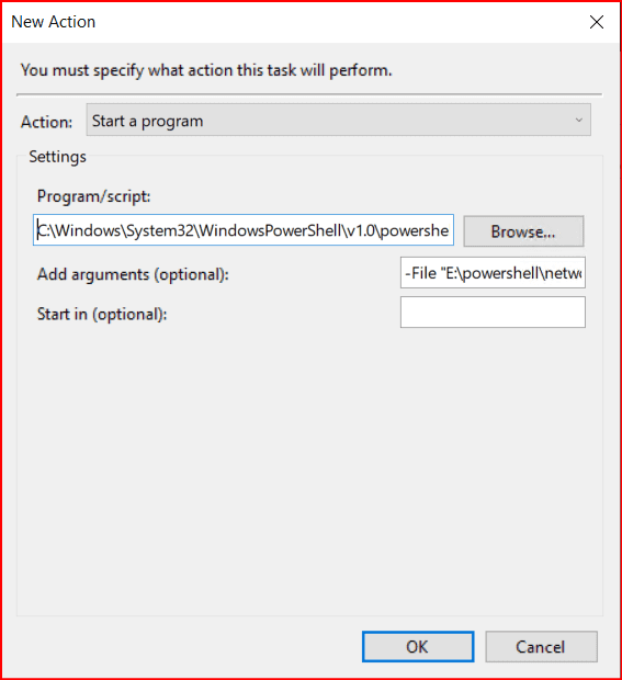 Actions kısmına gelip New deyip oluşturduğumuz powershell uzantılı dosyayı Browse.. sekmesinden seçiyoruz. Seçim yaptıktan sonra OK tuşuna basıyoruz.