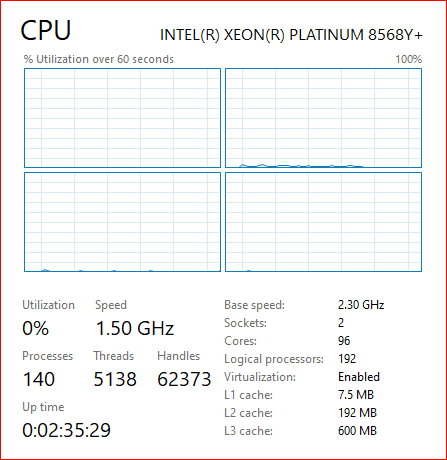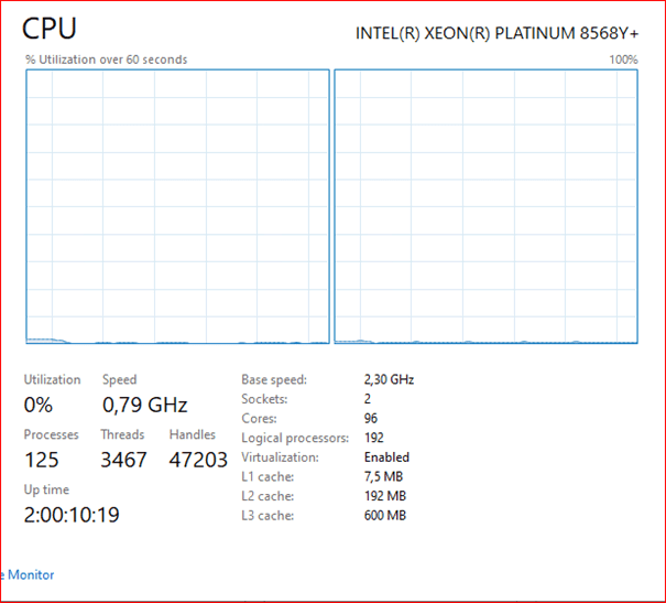 Sunucu üzerinde Task Manager ekranından Cpu üzerinde bulunan Numa yapısına baktığımızda 2 Numa görülmektedir.