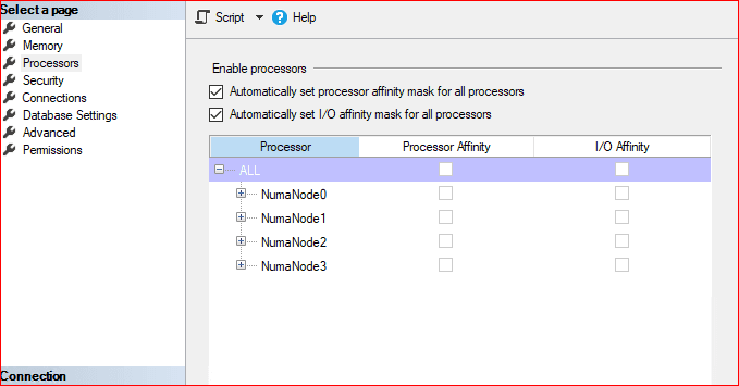 Sunucu üzerinde kurulu olan Sql server instance properties kısmında bulunan Processors kısmına girdiğimizde 4 tane Numa Node yapısının aktif olduğunu görmüş oluyoruz.