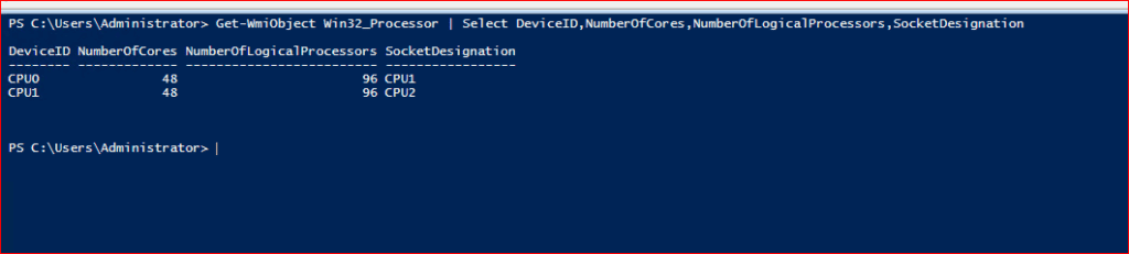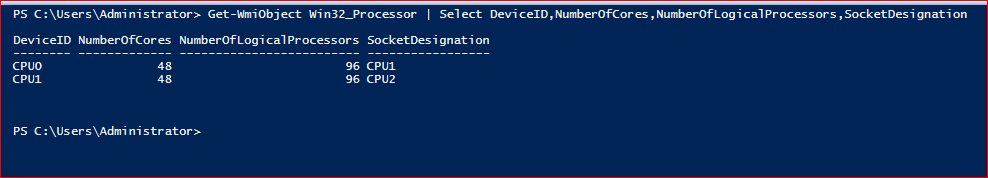 Get-WmiObject Win32_Processor | Select DeviceID,NumberOfCores,NumberOfLogicalProcessors,SocketDesignation