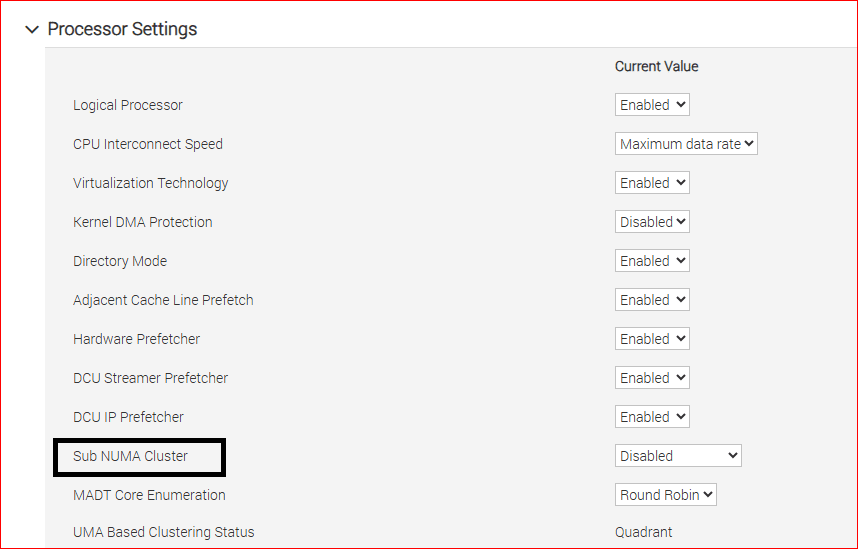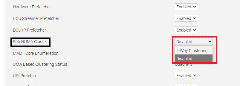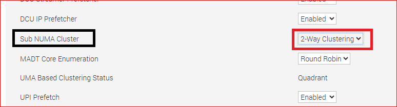 Aşağıdaki resimde 2-Way Clustering(SNC2) ifadesi her NUMA 2 alt Numa’ya bölünmektedir. 4-Way Clustering(SNC4) yapısı 4 alt Numa’ya bölme işlemi yapılması gerekmektedir. Disable ifadesi tek bir socket’in tek büyük bir numa Numa’ya karşılık gelmektedir.