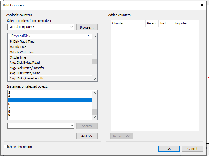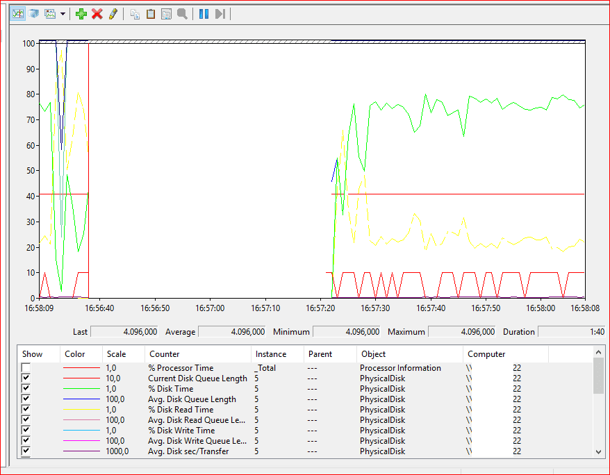 Windows Disk performansını canlı izlemek için backup veya başka büyük bir işlem çalışırken Performance Monitor açılır: