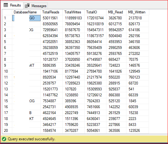 Aşağıdaki komut ile veritabanı seviyesinde okuma yazma sayısını okuma ve yazmların MB boyutunu ve toplam I/O değerini görebiliriz.