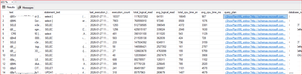 Aşağıdaki komut ile sorgularımızın memory üzerinden ne kadar okuma yaptığını bu okumlar sonucu cpu kullanım durumu ve sorgularımızın execution plan yapısını görebiliriz.