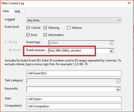 Windows disk hata kontrolü Event Viewer >Windows Logs >System bölümünden filtreleme yapılarak bakılabilir.