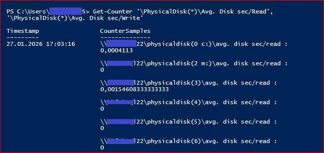 Get-Counter '\PhysicalDisk(*)\Avg. Disk sec/Read',