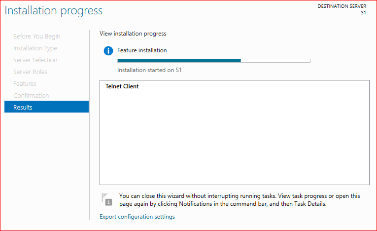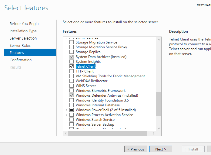 Kısacası iki sunucuda Telnet client yükle olması lazım. Bu özellikte server manager ekranında Features bölümünden eklenir.